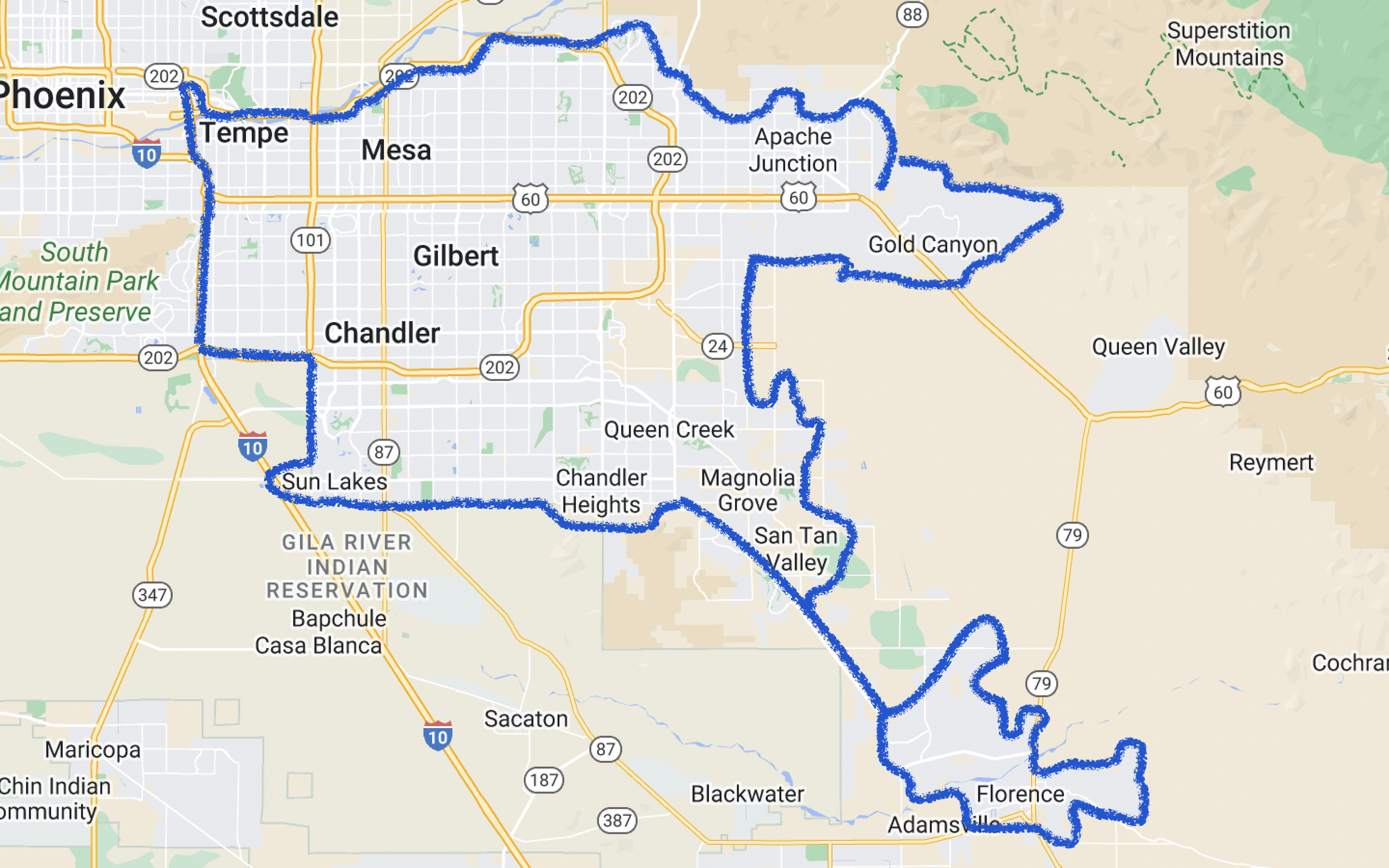 South East area, all the way north to upper Mesa, and far west of Tempe.